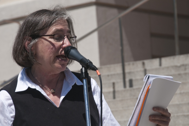 Laura Magnani, American Friends Service Committee: "I stand here with a mixture of excitement and horror. Horror at the conditions faced by 1,200 prisoners at Pelican Bay and over 3,500 prisoners in security housing units throughout California. Excitement that the prisoners have successfully organized across racial groups to take this action. This is a tremendously courageous action—to go on hunger strike, when people are virtually on starvation diets to begin with—to deprive themselves of food for we don't know how long. And it is extremely important that we be here to support them and show our solidarity…. There are 1,440 security housing units across the country in state facilities, federal facilities and some, I think even in local jails. There's at least 25,000 in long term isolation across the country but probably the figure is closer to 70 to 80 thousand if you include all forms of isolation."