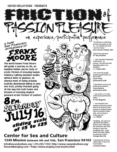 The world known shaman performance artist Frank Moore will guide a journey to Lila, an invisible hidden secret state of erotic friction of arousing human intimacy rubbing between bodies without limits or glamour, an altered state of being actively lustfully abandoned willing to play and trust, prickly freedom going all the way into both fusion and infusion of arousing magical pleasure erotic friction of comfort.