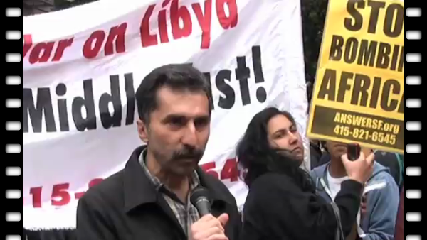 War? Mazda Majidi and Stephanie Tang discuss the 'kinetic military action' in Libya at the July 9, 2011, demonstration in San Francisco called by the ANSWER Coalition.