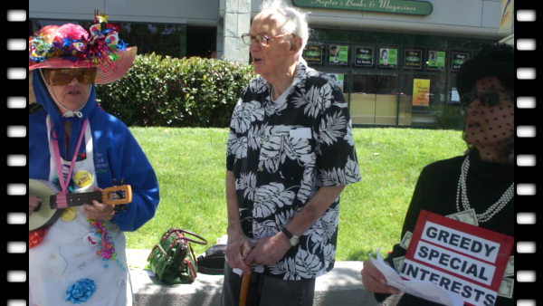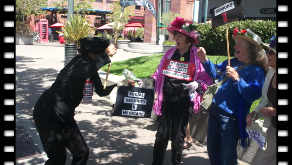 Medicare's 46th birthday is July 30th. Members of the Raging Grannies and community members celebrated and at the same time expressed deep concern about threatened cuts. KTSF-TV aired a lengthy segment of the protest. Videos by R. Stevens for indybay 0:19 and 0:21 in length. Photos by Elano Tool and R. Stevens.