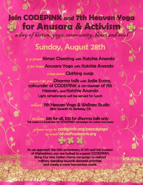 As we approach the 10th anniversary of 9/11 and the invasion of Afghanistan, CODEPINK is seeking to amplify our voice and creative contributions in the movement for peace and justice. We'd like to invite you to support this vision and join us at 7th Heaven Yoga Studio in Berkeley for a day of kirtan, yoga, clothing swap, and dharma talk with Jodie Evans and Katchie Ananda (or just come for the dharma talk). For ticket reservations and more event details, please see the official Anusara & Activism web page.