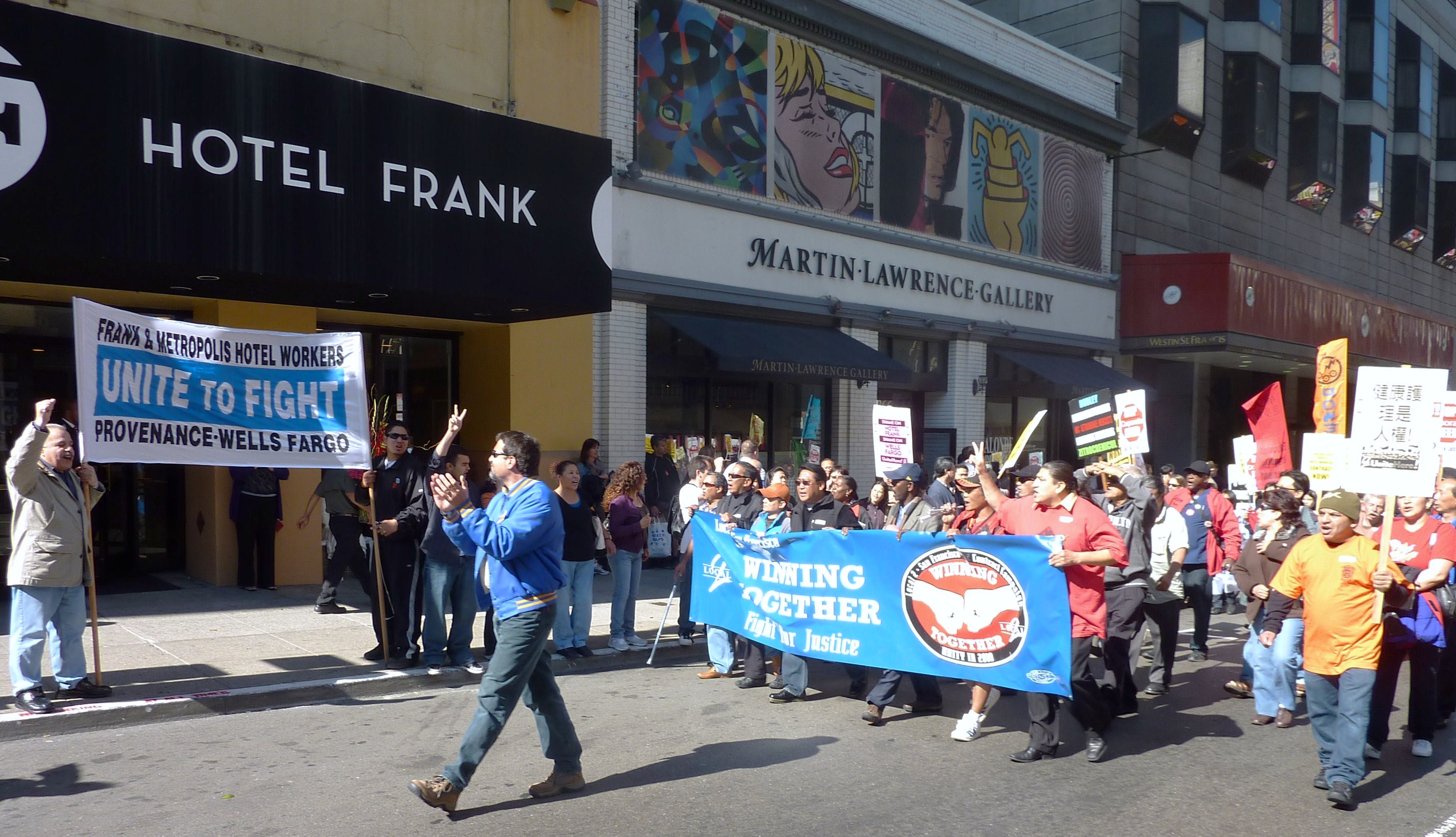 Workers at Hotel Frank have been under attack since Wells Fargo foreclosed on the hotel in May, 2010. Wells Fargo brought in a new management company, Provenance, which refuses to recognize the UNITE HERE Local 2 contract, has not paid anything for medical coverage or pensions, has dangerously increased the workload for room cleaners and other workers, and has fired Union organizers.