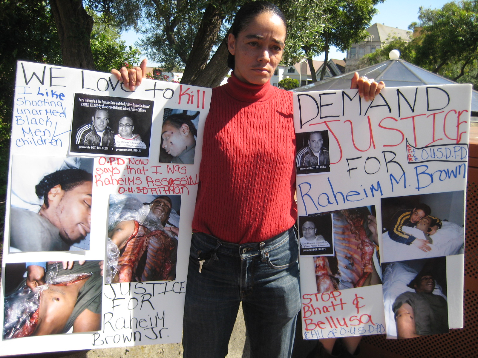 More than one hundred Bay Area residents rallied in front of the OUSD building on 2nd Ave and e10th Street in Oakland to call for the immediate disbandment of the school police and the firing of Officers Barhin Bhatt and Jonathan Bellusa who shot Brown multiple times after claiming he brandished a screw driver. The only civilian witness on the scene, Tamisha Stewart, says Bellusa and Bhatt murdered Brown after calling him racist epithets, that Brown was unarmed and not a threat to the police.