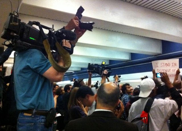 Today's action -- dubbed #OpBART -- was widely announced through social media sites and the Anonymous network. Anonymous, a nebulous group of cyber-activists, hacked BART's web site over the weekend to protest the cell phone censorship. The action drew a few hundred people, though at times it appeared that media outnumbered activists (and indeed, many people filled both roles). Police ordered protesters to leave after about 20 minutes and BART closed Civic Center station. Activists then dispersed, some marching on Market Street and others protesting at other downtown BART stations. At one point BART had closed all stations between Civic Center and Embarcadero.