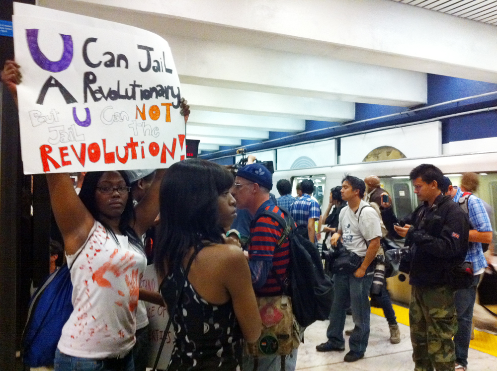 Activists came out in force at Civic Center station in San Francisco on Monday to protest BART police violence and the agency's shut-down of cellular phone service in attempt to quell a previous planned protest last week.
