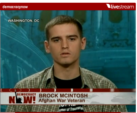 -Brock McIntosh is an Army National Guard veteran also deployed to Afghanistan and is applicant for Conscientious Objector (CO) status. He has worked as a spokesperson with 'Veterans for Rethinking Afghanistan' as well as being active with IVAW and Operation: Recovery. Brock has focused on the non-violence movement including training at the 'Center for Nonviolence & Peace Studies' and an internship at 'Win Without War'.