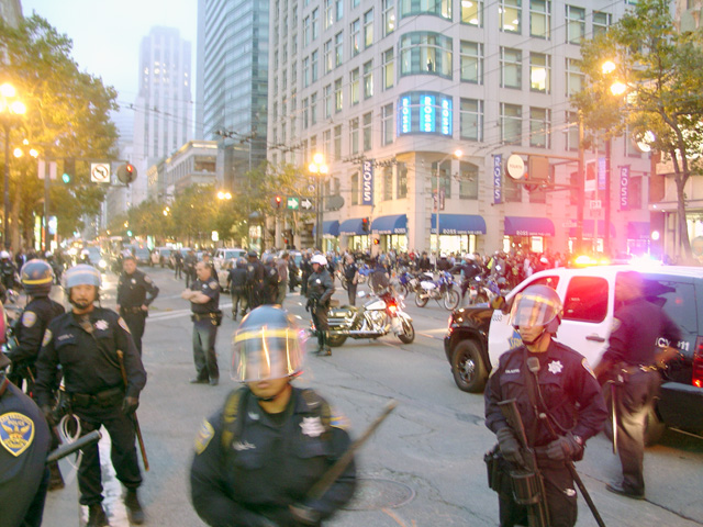 [Pictured above: Police line has pushed large group of demonstrators out of Market Street and onto sidewalk]