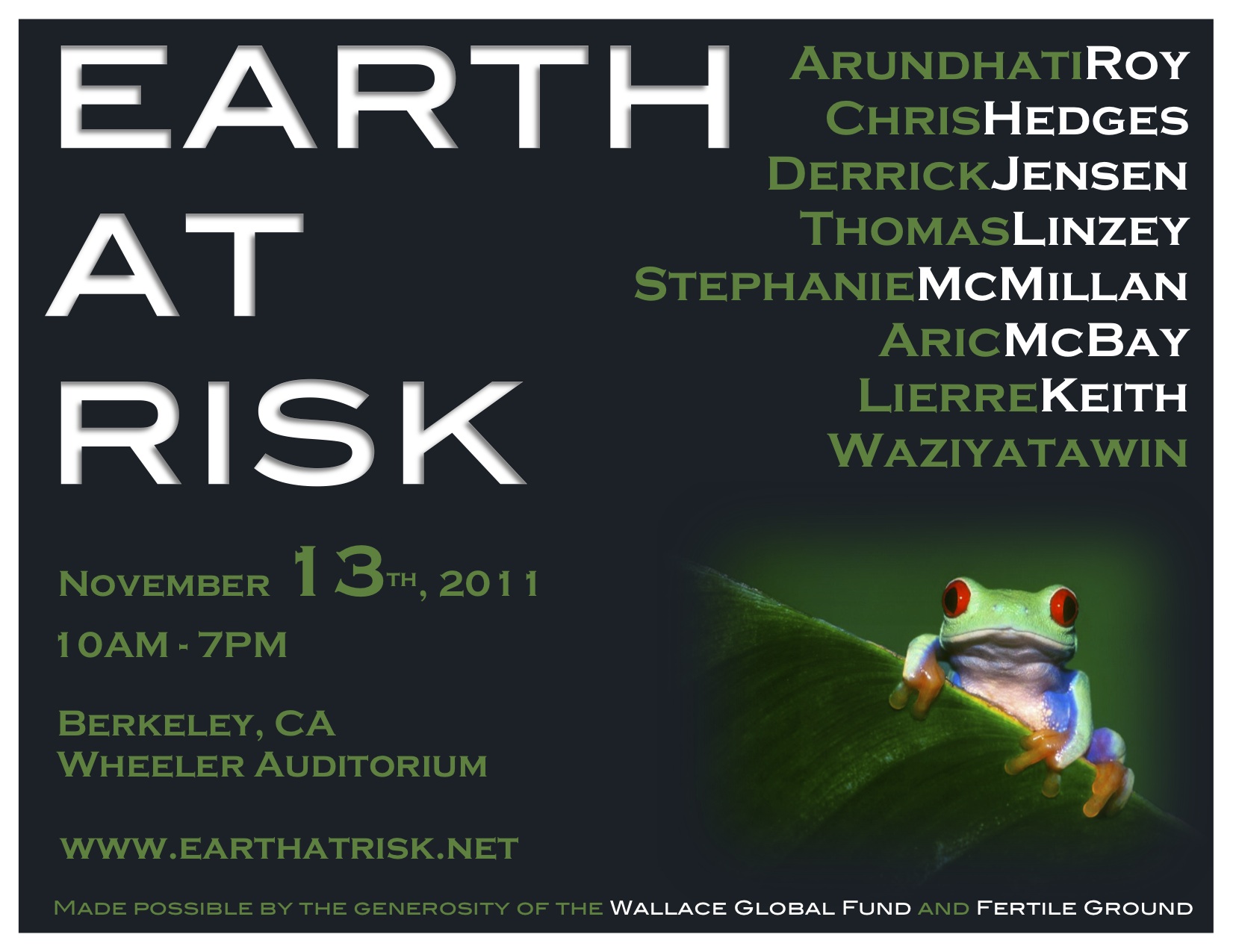The "Earth at Risk" conference will feature Arundhati Roy, Chris Hedges, and Thomas Linzey among others in a day-long series of interviews with Jensen before a live audience.