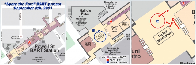 [Illustrated above: Powell Street station map with protester, media, and police movements. Click to enlarge. Original source: http://bart.gov/stations/powl/map.aspx]