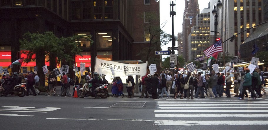 On Thursday evening, Palestinians and human rights advocates from around the tri-state area marched through the rain to the United Nations headquarters. With the world’s attention focused on the scheduled vote for Palestinian statehood, demonstrators converged to demand sovereignty, equality for Palestinian citizens of Israel, and the right of Palestinian refugees to return to their homes, in accordance with UNGA Resolution 194.