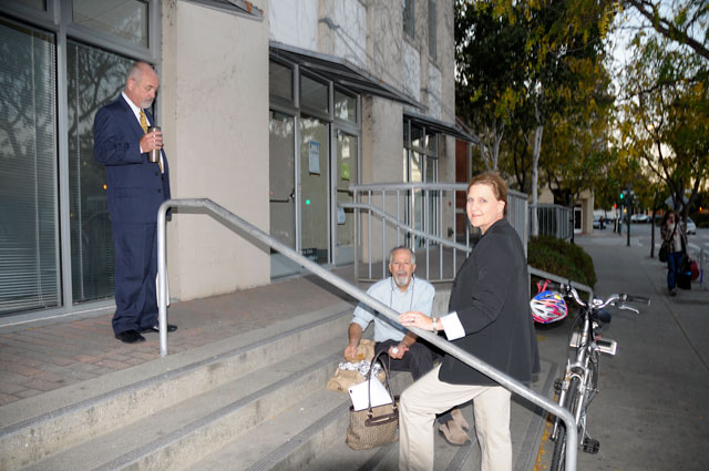 I arrived at the museum about 15 minutes before the 7:30pm starting time for the event, with the intention of photographing those who attended, and to report on the scene outside. At that time approximately 20 people were quietly protesting at the Front Street entrance. The bulk of the group was comprised of people distributing printed information on behalf of the organizations Santa Cruz Desal Alternatives and Transition Santa Cruz. Paul Gratz, one of the leaders of Santa Cruz Desal Alternatives, was among them. Also in attendance was a handful of other observers and protesters who were not affiliated with those organizations. Attorney Ed Frey was handing out small fliers imprinted with his web address, and Attorney and city council candidate Steve Pleich was also outside. He made it clear that he was not invited to the meeting, and he was not protesting; he was there to observe. He left rather quickly to attend that same evening's ACLU meeting, for which he is a board member of the local chapter. One man was using a hand held video camera to videotape the people entering the museum.