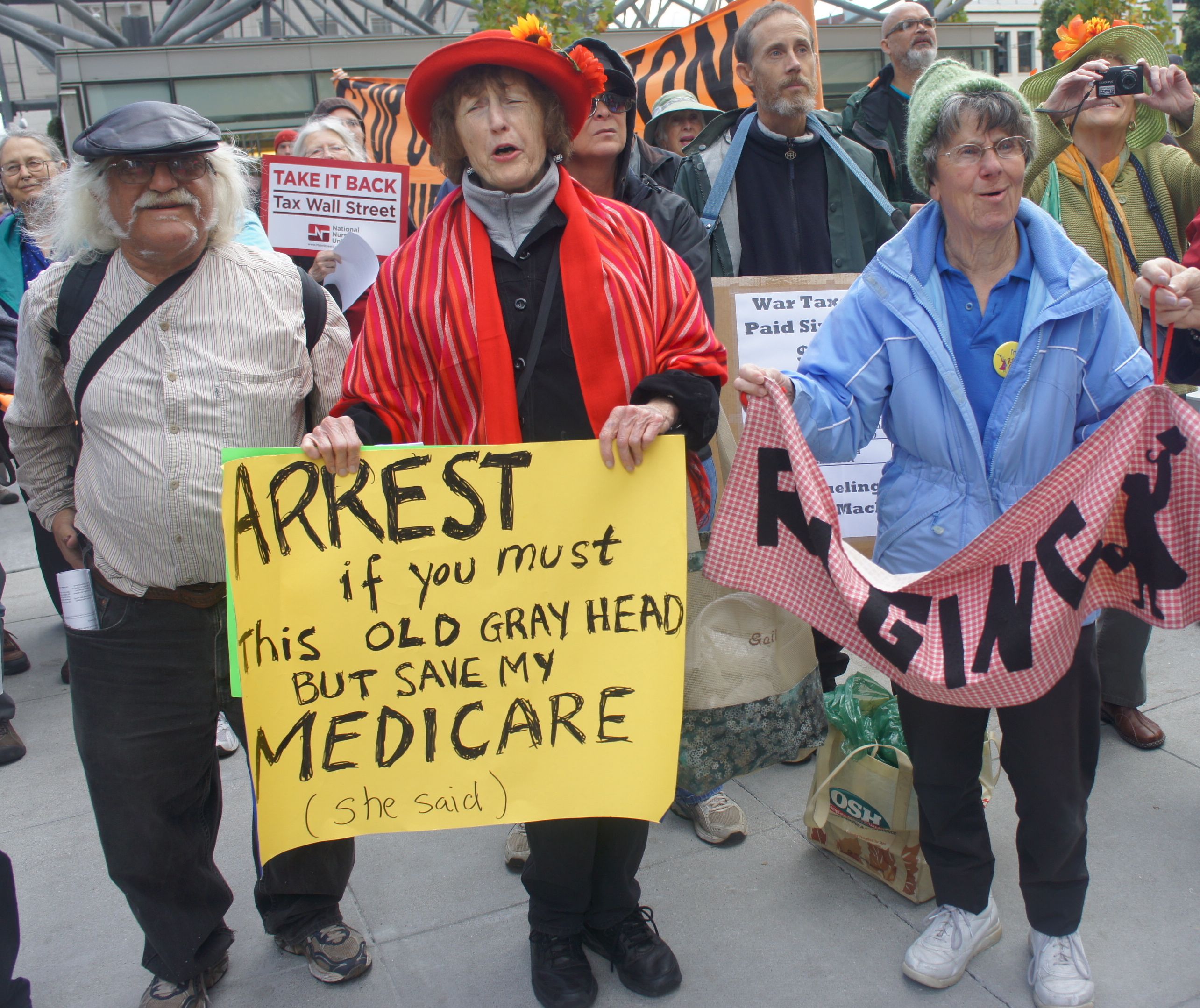 It included open-mic periods for participants to suggest further actions on ending the wars, supplying our needs, taxing the rich, and protecting the environment. The Raging Grannies sang their message during open-mic period.