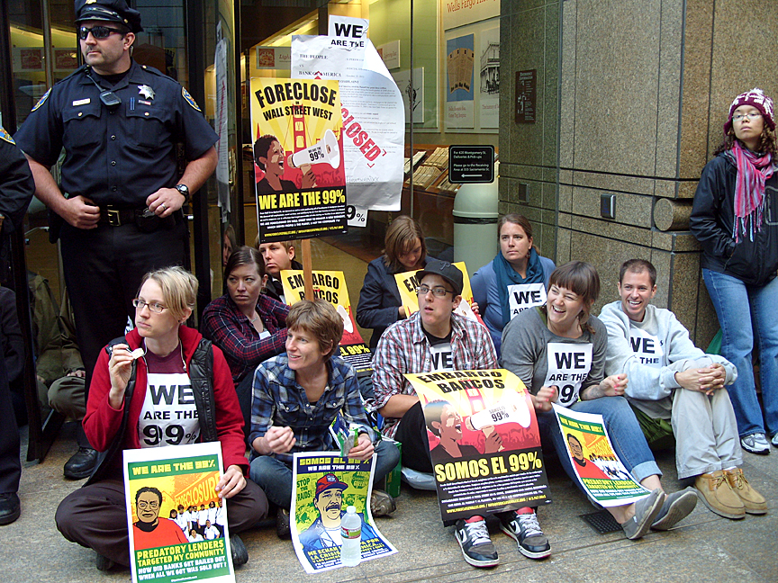 Foreclose the Banks action in downtown San Francisco. About 800 people marched to Wells Fargo offices in the heart of the Financial District. About fifty blockaders shut all entrances to the bank. Police arrested 11 people at one entrance around 8am. The branch office remained closed through the morning.