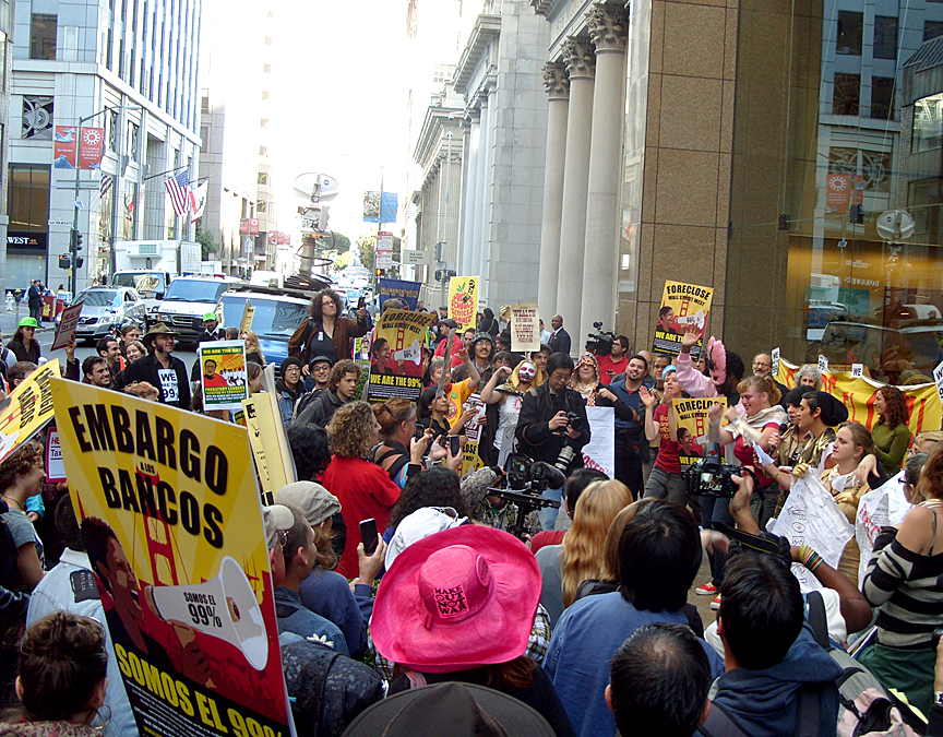 Foreclose the Banks action in downtown San Francisco. About 500 people gathered at 7am and marched from the OccupySF site at the Federal Reserve to Wells Fargo offices on Montgomery Street in the heart of the Financial District. Feeder marches swelled the crowd to about 800 as we arrived at Wells Fargo.