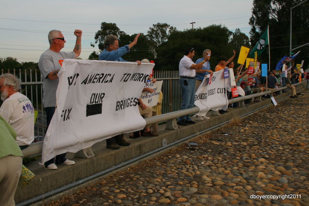 Residents from San Mateo held banners and signs on bridge over Route 92. The bridge was Alameda de las Pulgas.
