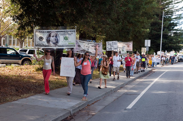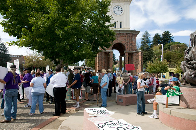 Approximately 75-100 community members attended the march. Many participated with the intention of closing their bank accounts, but all three of the major banks locked their doors as soon as they became aware that the protesters were arriving. A set of march 'rules' was announced at the rally at the town clock, and the march route was tightly pre-planned by event organizers; marchers hoped to make their way through the downtown along Pacific Avenue, but they were diverted down Front Street. Also, the list of banks visited was pre-planned, and not publicly explained was the reason for Lighthouse Bank being chosen as the local bank to visit.