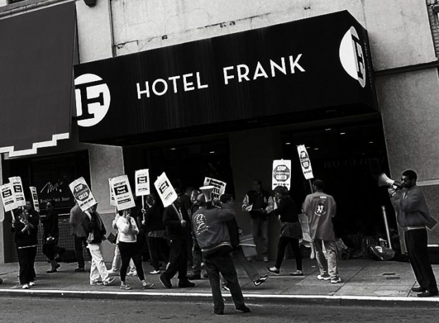 Workers at Hotel Frank have been under attack since Wells Fargo foreclosed on the hotel in May, 2010. Wells Fargo brought in a new management company, Provenance, which refuses to recognize the UNITE HERE Local 2 contract, has not paid anything for medical coverage or pensions, has dangerously increased the workload for room cleaners and other workers, and has fired Union organizers.