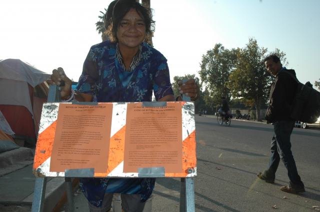 Over on Santa Fe (south of Ventura) Rose stood around a morning fire with about 10 other homeless people. They were cooking breakfast when I arrived. Rose had called to let me know about these evictions. She introduced me to Patchrich, who asked what would happen if all of the homeless were to link there arms and refuse to allow the city sanitation workers to do their jobs on Thursday.