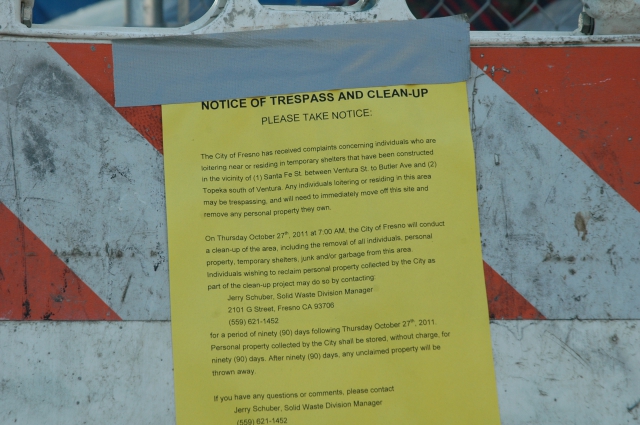 The City of Fresno has posted notices to evict people in all of the downtown homeless encampments. The first evictions, on Santa Fe south of Ventura, will take place on Thursday October 27. Evictions at all of the other encampments - The Hill, G street, Santa Clara street, F street, and at San Benito/H street will take place on Tuesday, November 1.