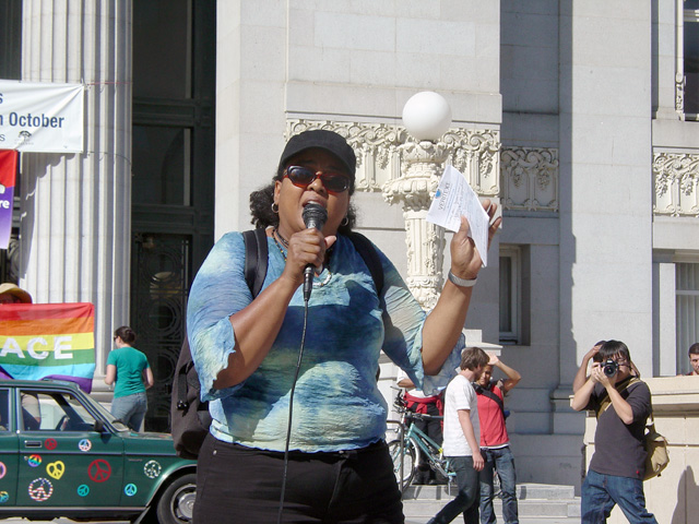 [Pictured above: Speaker addresses those assembled in the Oscar Grant Plaza amphitheater before the march.]