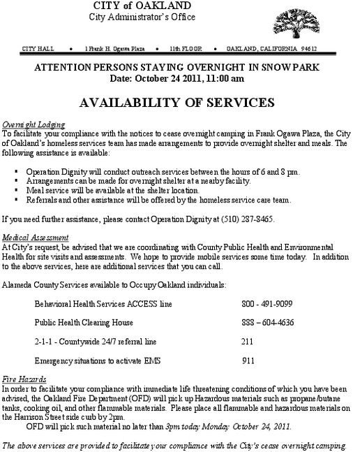 Arturo M. Sanchez, Assistant to the City Administrator, paid occupiers in Frank Ogawa a visit this morning as more warnings were handed out to vacate all property and persons from the plaza or face arrest. The Oakland fire marshall also stopped by to complain about propane tanks that the kitchen has been using to prepare hot meals throughout the occupation. Here are today's notices and demands: