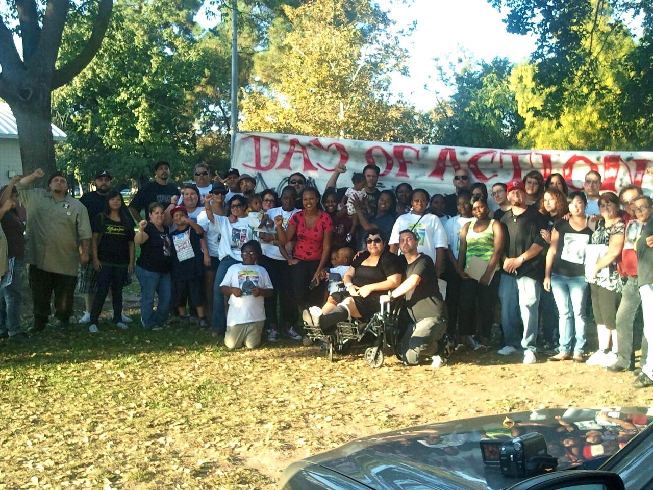 Marching towards West-Side Modesto, people took to the street, chanting, "Who's Streets? Our Streets!" A CHP officer followed behind the march and told the crowd to get out of the street and onto the sidewalk, but after it became apparent that no one would comply, he left the scene. While marching, passersby were handed fliers about the ongoing hunger strike in Pelican Bay Prison as well as a time-line of Police Repression in the Central Valley. Upon reaching the park, members of different families affected by police violence talked about their struggles, and several speakers discussed the need to organize against police, attacks on migrant workers, and the overall assault on poor, working, and oppressed people.