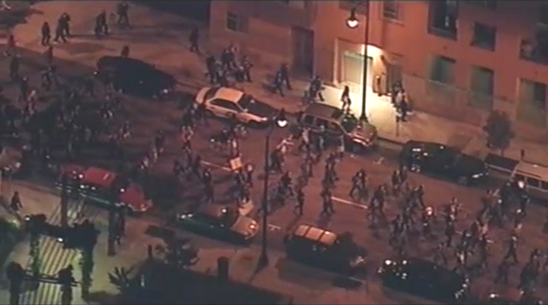 Images liberated from corporate media site. Screen grabs from helicopter raw feed show the marchers taking the streets of downtown Oakland last night after the retaking of Oscar Grant Plaza.