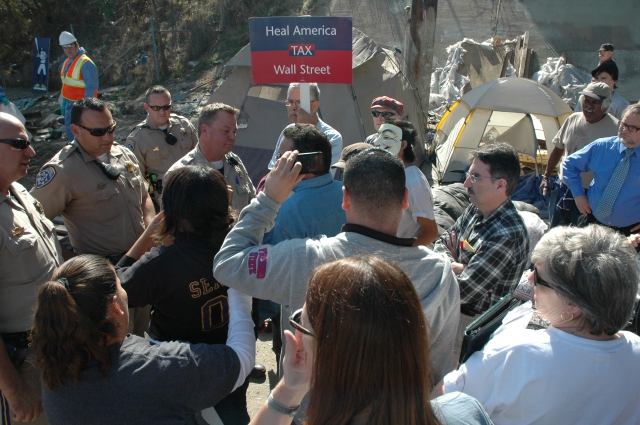 The City of Fresno and Caltrans did what they said they were going to do today - they attacked the homeless encampment on Santa Fe street in downtown Fresno. But, they did not destroy the encampment without being confronted with significant resistance by community members who protested the eviction. The first photo (below) shows a line of resistance that formed when the City of Fresno made their first attempt to destroy the homeless encampment.