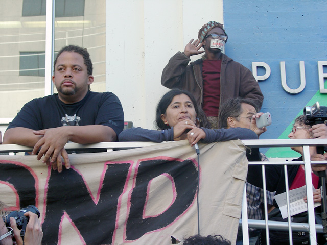 Later in the day, after the pre-dawn police raids at Oscar Grant Plaza and Snow Park, 1500 or more supporters gathered at 4pm in front of the Oakland public library's main branch to protest the police assault on Occupy Oakland. Speakers decried the mass arrests, the destruction of all of the the physical apparatuses of the occupation, and the use of force against occuppiers including tear gas, a flash bang grendade, and projectiles. Oakland Mayor Jean Quan was a particular target of scorn for having ordered OPD to clear out the encampments. Speakers passionately expressed determination that the brute force of the police would not stand in the way of the occupy movement as it confronts the growing economic inequalities in this country. [Audio below]