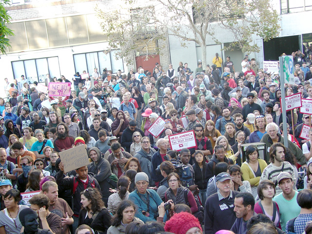 [Pictured above: mass gathering at main branch of the Oakland public library on 14th Street]