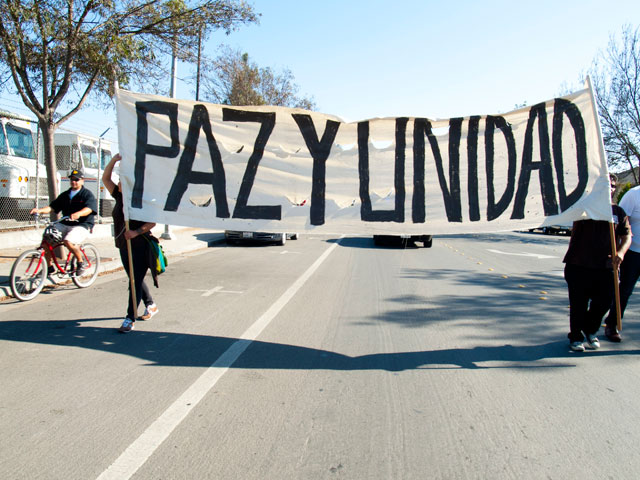 After the opening ceremony the march proceeded along a two-hour route through both Norteño and Sureño neighborhoods, the two traditionally opposed gangs in Watsonville. Carrying signs ranging from “Basta la Violencia” (“Enough Violence”), “Necesitamos Paz” (“We Need Peace”), “Stop the Violence”, “Love is Everything”, and “United We Stand, No More Killing Please”, the marchers chanted protest slogans like “Los Barrios Unidos Jamas Serán Vencidos” (“The Neighborhoods United will Never Be Defeated”), and shouted their desire for peace to neighbors and bystanders, inviting them to join the march. Families of victims carried signs, photos, and altarpieces, or wore tee-shirts commemorating their fallen loved ones while men, women, and children watched and waved from porches and windows.