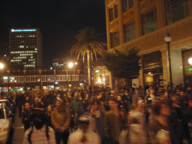 [Pictured above: marchers on Broadway leave the scene after police threat, regroup and strategize about retaking Oscar Grant Plaza]