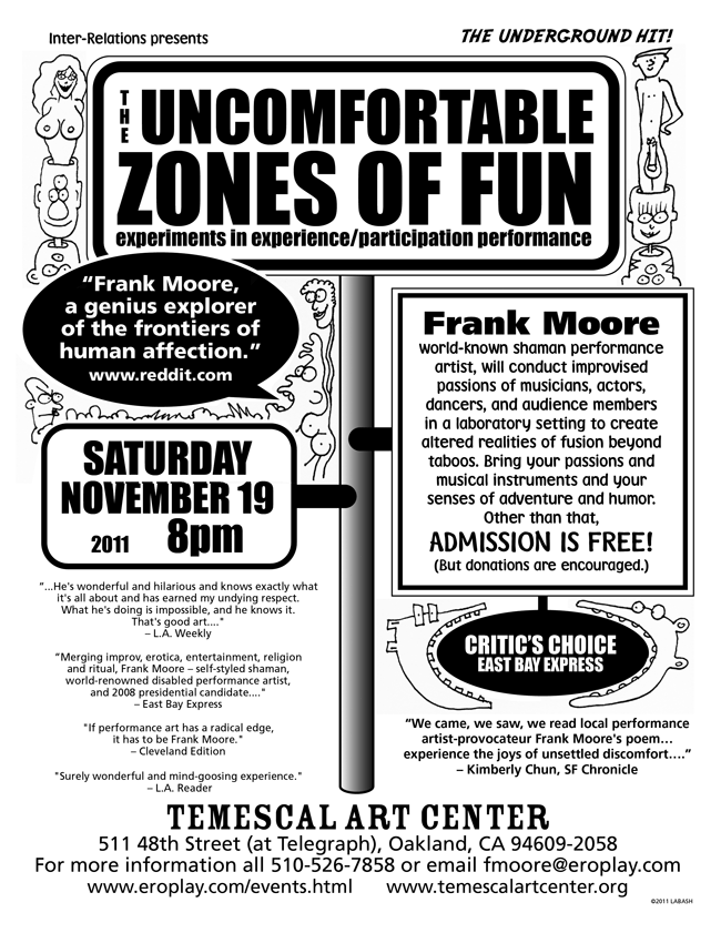 “Merging improv, erotica, entertainment, religion and ritual, Frank Moore – self-styled shaman, world-renowned disabled performance artist, and 2008 presidential candidate ...." – East Bay Express