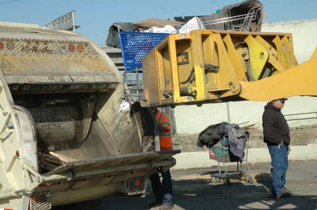 Photo above: These two homeless men watch as the City moves in to “clean up” their camp.