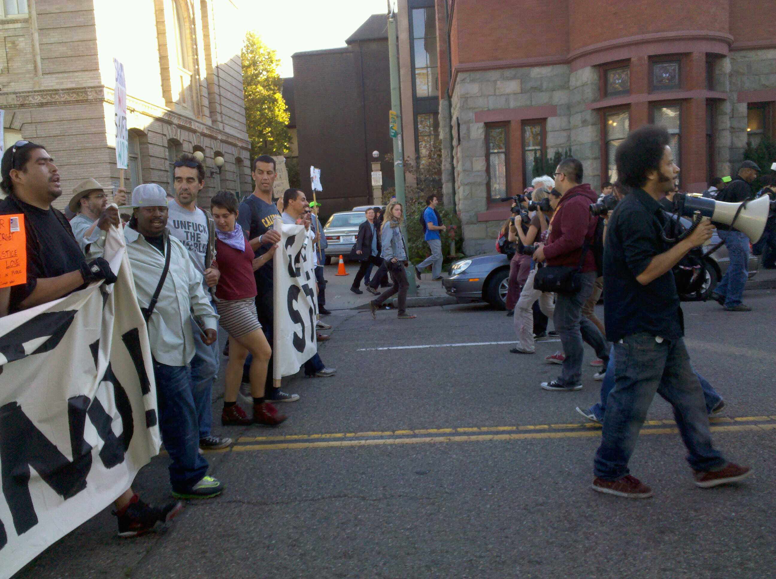 Wednesday Nov 2nd, 2011 10:17 AM : Crowd rallying at 14th & Broadway now marching toward "the banks." #OccupyOakland