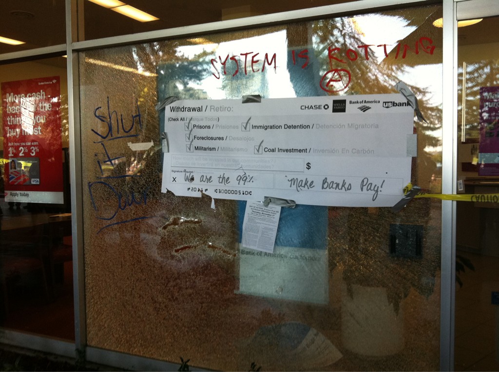 @susie_c: #oaklandstrike B of A on Lakeshore is thoroughly trashed. Paint, grafitti, signs, broken windows & ATMs