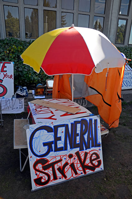 In solidarity with the call by Occupy Oakland for a general strike, which was in response to the police violence in Oakland that resulted in the serious injury of Scott Olsen and others, Occupy Santa Cruz members called for a strike to be held in Santa Cruz on November 2. Suggestions to avoid work and or/school were made, and community members gathered at the county courthouse steps for a march and demonstration downtown.