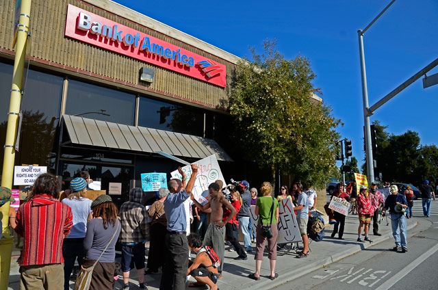 Approximately 50 people participated in the march, which first made visits to Bank of America and Wells Fargo, then continued downtown to Friendship Garden in front of Jamba Juice and the Flatiron building, where a rally was held that featured an open mic segment. Among a variety of topics, people spoke about what was going on at Occupy Oakland, and they spoke about Scott Olsen and paid tribute to him, including chanting repeatedly in unison, "I am Scott Olsen, I am Scott Olsen." On the way back to the county courthouse occupation location, the demonstrators stopped again at Bank of America. Both that bank and Wells Fargo still had security guards in place that locked the doors when protesters arrived.