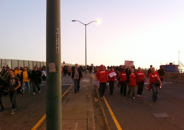 A festive atmosphere was in effect at the port. Even as many of the daytime marchers began to leave around sunset, new activists continued to arrive. Protesters maintained picket lines at all entrances to the port, reportedly halting work. Active pickets were required during each port shift change in order for unions to refuse to work under the terms of their contracts. Police for the most part left demonstrators alone, and there had been no major skirmishes at the port when most protesters left by 9-10 pm.