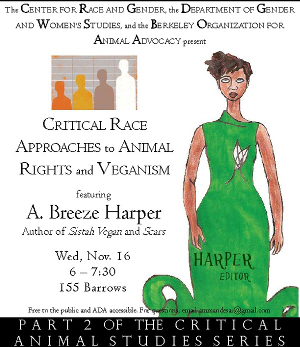 Harper will be visiting the UC Berkeley campus to give a talk intersecting race and animal oppression. Her talk will bring a nuanced critical perspective on animal rights and veganism through understandings of the interplay of race in looking at animal oppression and vegan spaces.