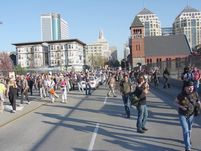 [Pictured above: First wave of marchers on 14th Street leave downtown at 4pm, crossing I-880 here with City Hall and Federal Buildings in background]