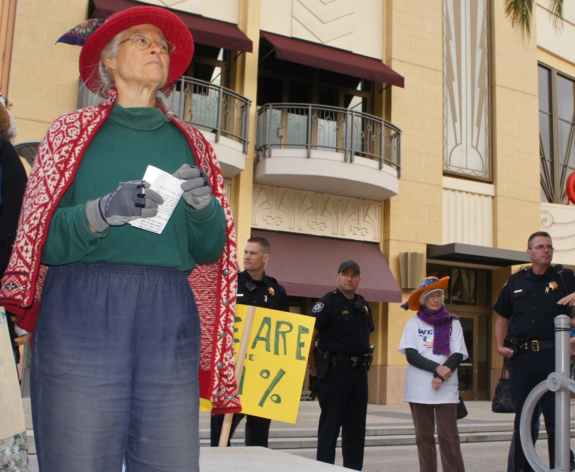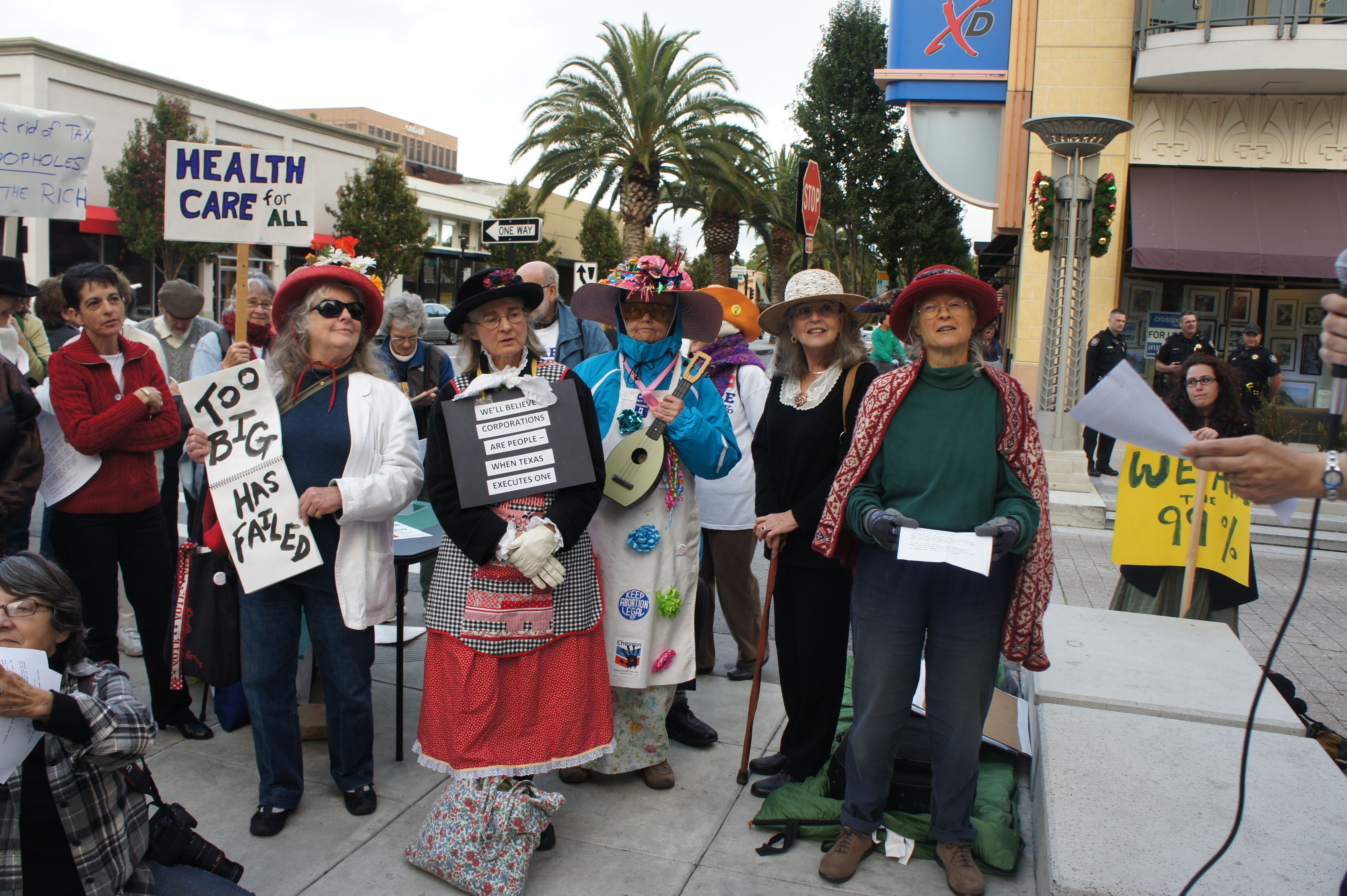 Not everyone at a rally of about 90 people was on the same page politically, some are possibly infiltrators as they have been heard to say "Stop the Occupation". So the Raging Grannies sang and chanted their Pro-Occupy feelings; the audience joined in with great gusto. Song courtesy of the Santa Cruz Raging Grannies.
