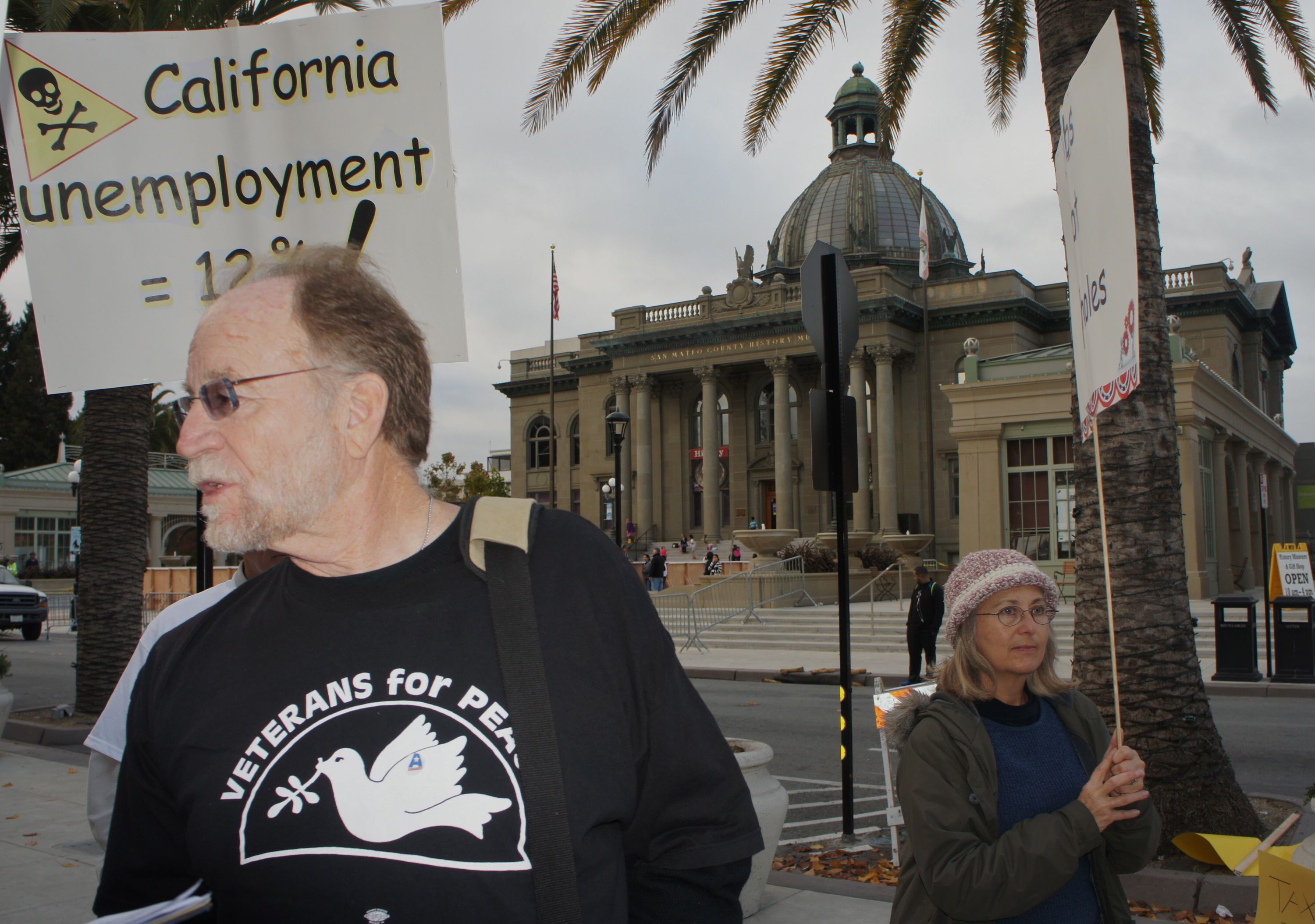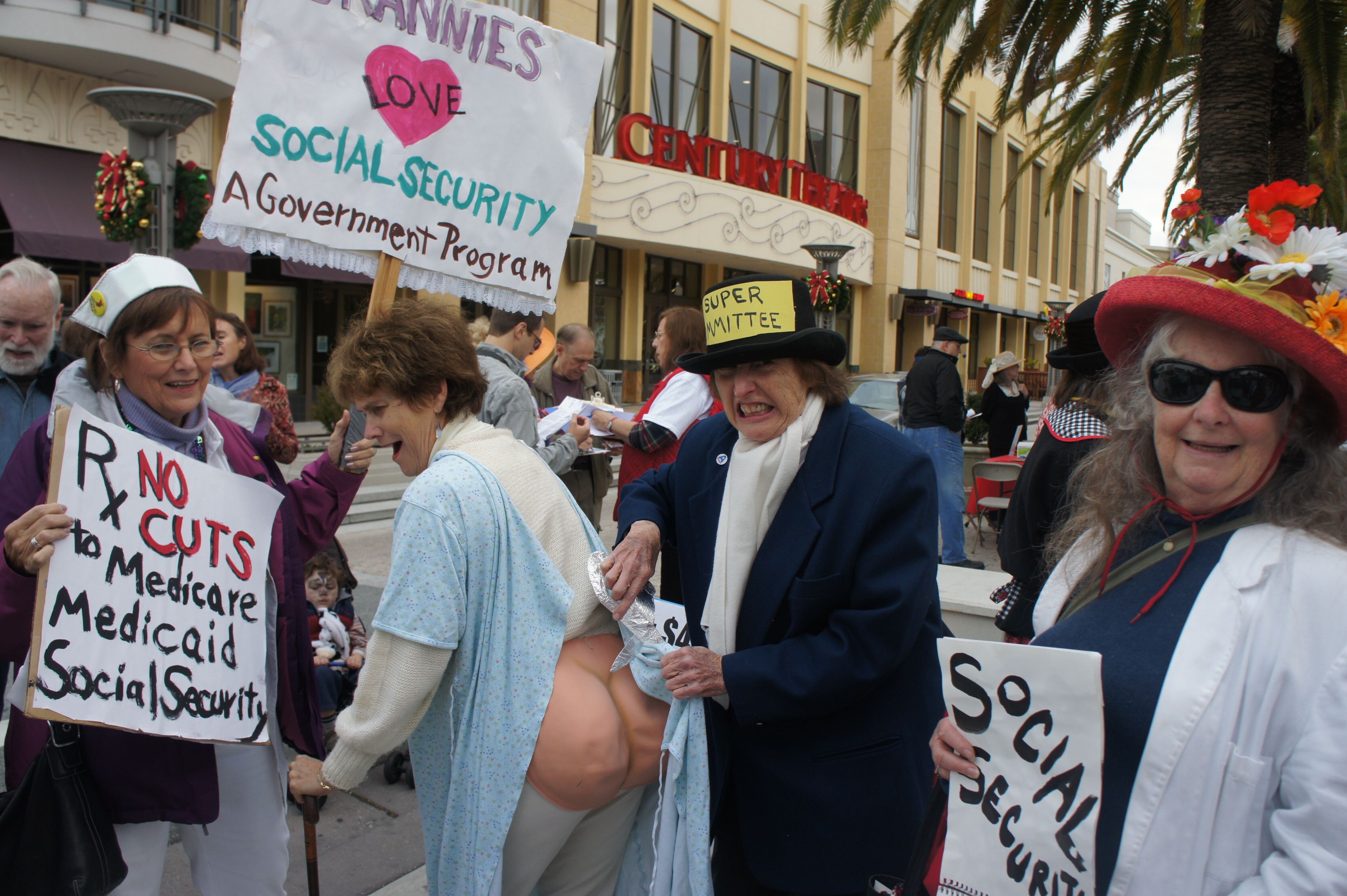 The Super Committee is getting ready to cut benefits! The Action League Raging Grannies joined a Redwood City rally on November 17 with a skit that demonstrated how cuts will leave us overexposed and "undercovered".