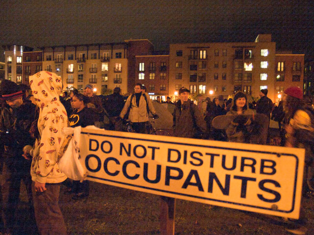 On November 19th, Occupy Oakland held a rally and march which began at Oscar Grant Plaza (aka Frank Ogawa Plaza) located at 14th and Broadway in Oakland. Thousands of people wound their way through Oakland, including around Lake Merritt, before stopping to set up a new occupation in the park and empty lot on 19th and Telegraph in the Uptown neighborhood and entertainment district. As of 11:30pm, the camp was intact and there were no reports of clashes between police and demonstrators.