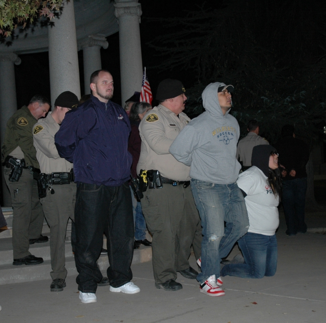 There were about 50 people standing vigil on the sidewalk on the side of the park when the arrests took place. As the lines of sheriffs marched into the park, Occupy Fresno members chanted “Hell No, We Won’t Go, Occupy Fresno.”