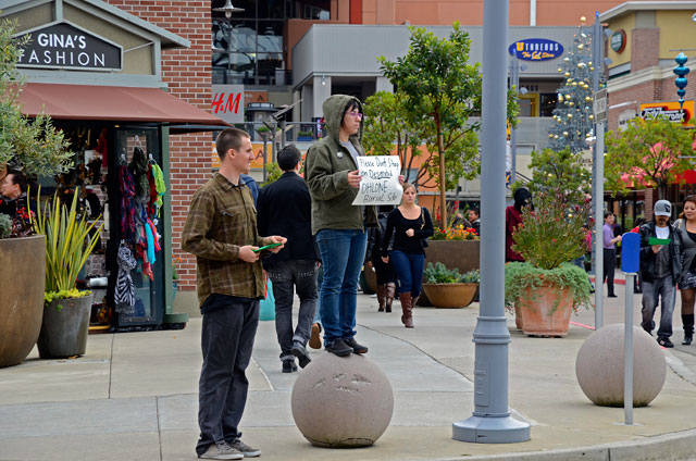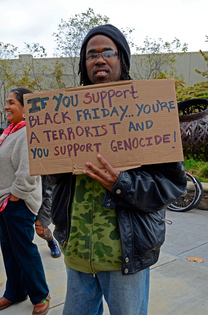 A short rally during this year's demonstration featured speeches by Ohlone and Native American activists as well as a representative of Occupy/Decolonize Oakland. Native American community members also sang songs, drummed, and played clap sticks. A list containing the names of alternative chain store locations was handed out to shoppers in addition to other printed materials.
