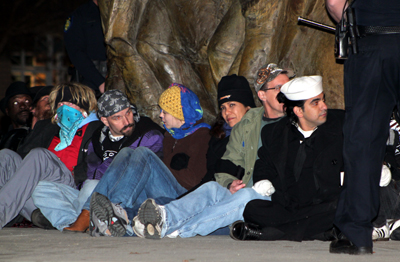 The activists - including military veterans from the Vietnam and Iraq wars marking the anniversary of the attack on Pearl Harbor - were arrested early Thursday morning about 2:30 a.m. during a "First Amendment Party" at Cesar Chavez Park.
