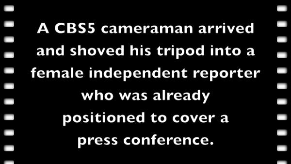 The female reporter pointed out to the the CBS-5 camera person that he had jammed his tripod into her and asked if he could move over a few inches so that it wasn't pushing into her. He had room to do so without bumping into anyone else, but he refused to budge. She asked him again if he could move his camera just a little and added that her video work was important too. He looked at her more modest camera and scoffed. The CBS-5 camera person then swung his camera lens nearly ninety degrees to the left by moving the handle on the back of his tripod sharply to the right, thereby shoving the tripod handle into the female reporter. He pretended to be unaware of the handle having been shoved into the side of the female reporter, as if there was some justification for his sudden interest in aiming his camera in a completely different direction from where the speakers would be. (No other camera person present had done anything similar with the positioning of their camera as they set up.) When the female reporter called out that the tripod handle was jamming into her, again asking if he could move just a bit to his left, the CBS-5 camera person again refused, indifferent to her pleas for a modicum of spatial courtesy. As he continued to poke into her with his tripod handle, she called him an "asshole". His immediate response was to call her a "bitch".