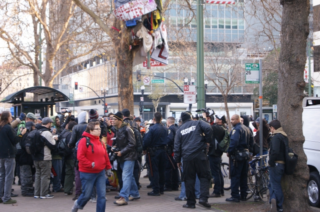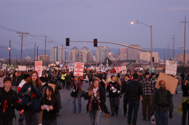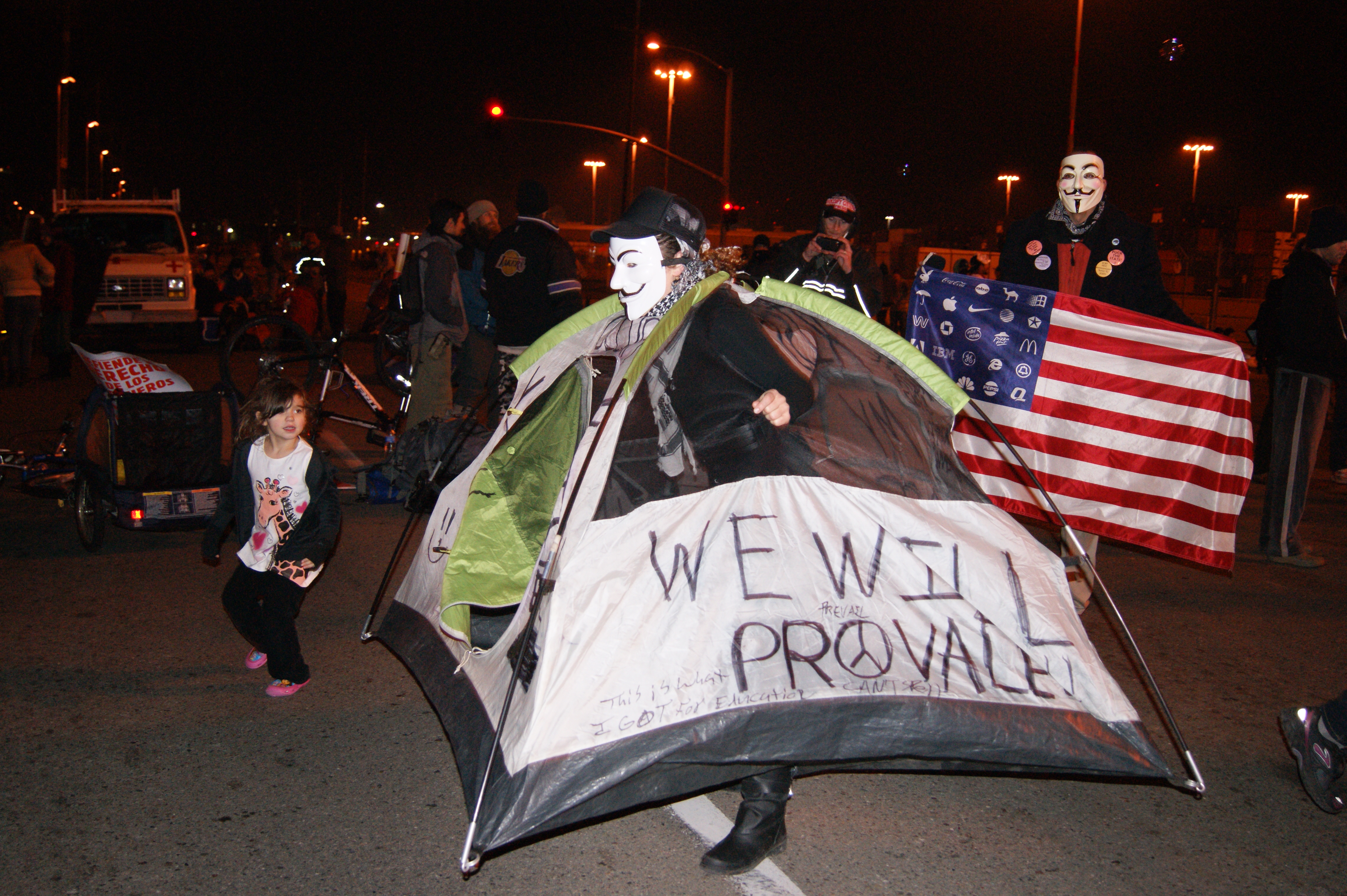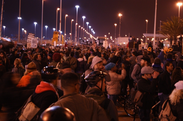I had fun in the afternoon helping the bike crew hold intersections before the oncoming marchers. Rather than become stuck in one position like the previous port closure, I was able to move around a bit, and having been to the previous I was able to "scout," around a bit, which is good for me to move my legs, keep up the blood temperature. I was able to chat up a lot of people, which is important to me, and I had fun dancing as the morning progressed. The Vegan pizza was vital, although I had the feeling that coffee was more important to others. There were other activities or actions that involved bicycles through out the course of events, and I was happy to be a part of a larger whole. I always encourage others to relate their findings of actions and events through photography and Indybay!