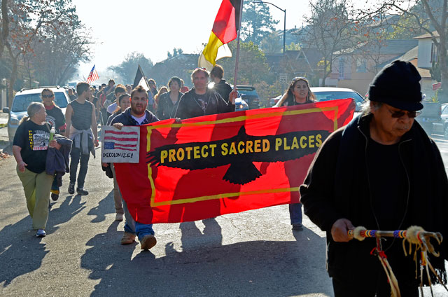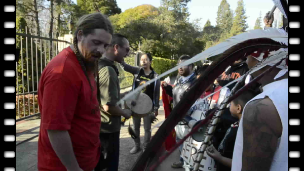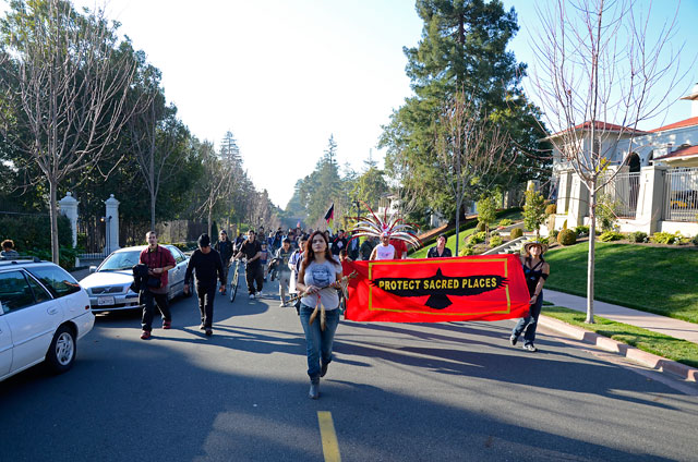 On December 17, approximately 75-100 community members protesting the desecration of Rattlesnake Island, the spiritual center of the Elem Pomo community, marched to the Piedmont mansion of John Nady, the owner of Nady Systems, who has been one of those pushing for the development of the island as the location of two luxury-style vacation homes.